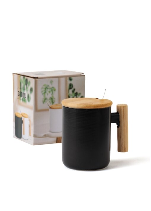 כוס פורצלן עם גימור במבוק, מכסה וכפית נירוסטה 380 מ”ל