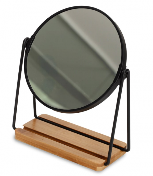 מראה שולחנית דו-צדדית, בעלת צד אחד בגודל טבעי וצד שני הגדלה פי 3, בעלת יכולת סיבוב 360 עשויה במבו איכותי, מסגרת מתכת וזכוכית קריסטלית 19X8.5X23 ס”מ. KR7050